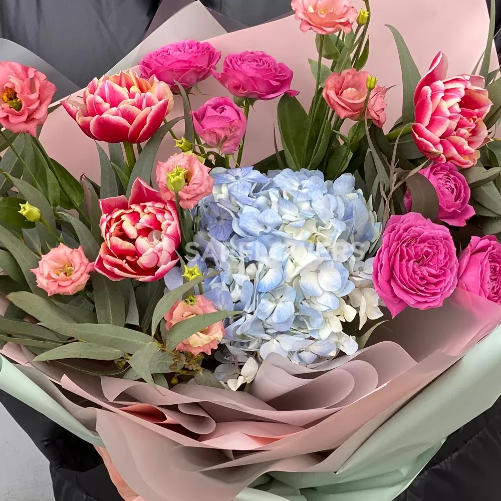 Состав: гортензия, роза кустовая пионовидная (2), тюльпаны (3), лизиантус (3), эвкалипт, упаковка (матовая пленка корея), лента, расходный материал.