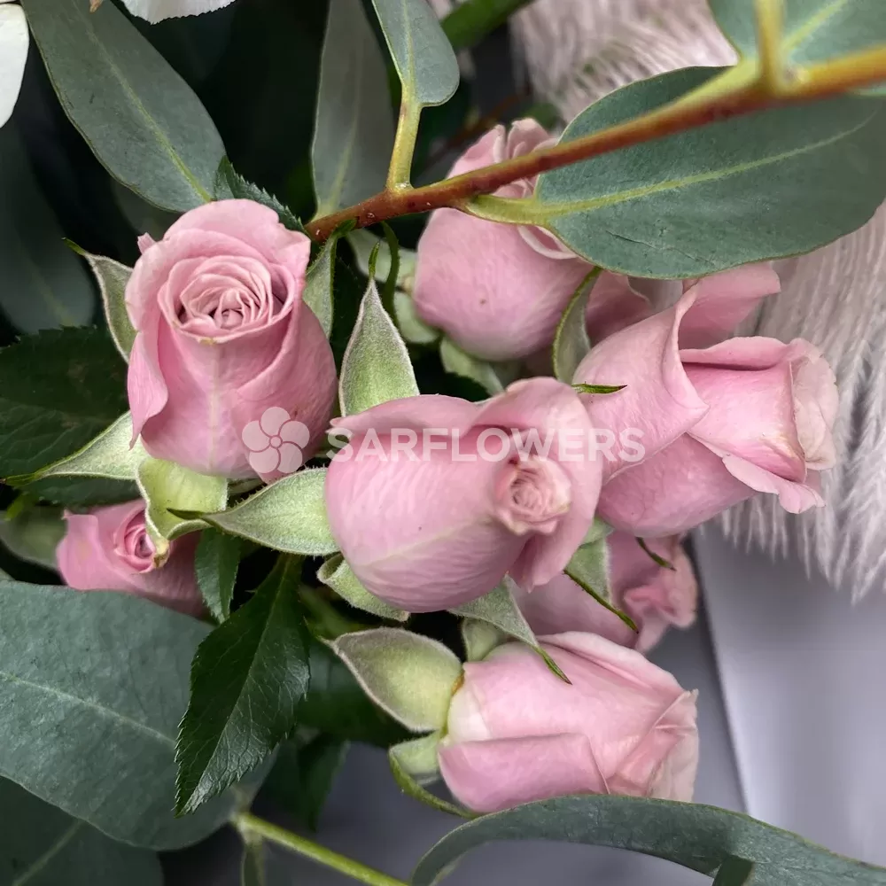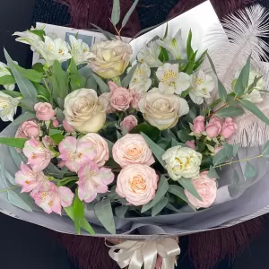 Состав: роза кустовая (3), роза кустовая пионовидная, роза (3), тюльпаны (2), альстромерия (3), эвкалипт, упаковка (матовая пленка), лента (шелк), перья, расходный материал.