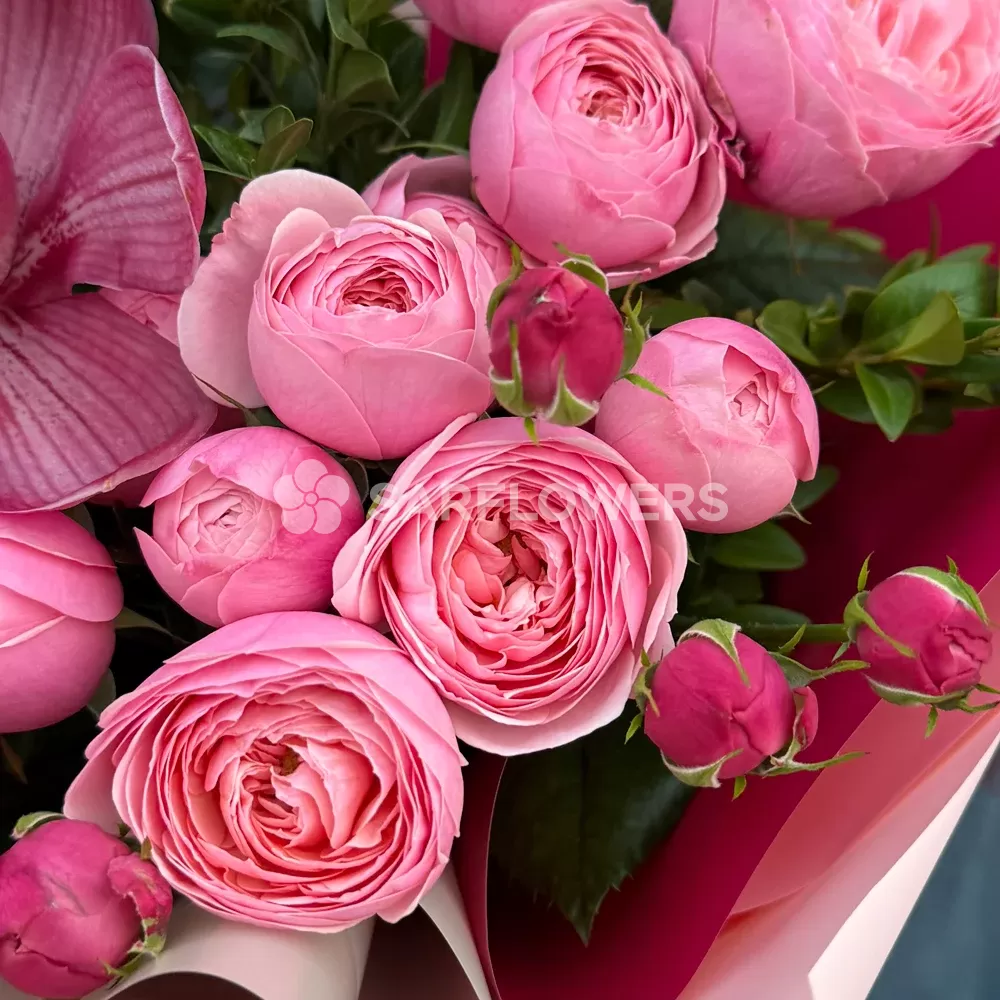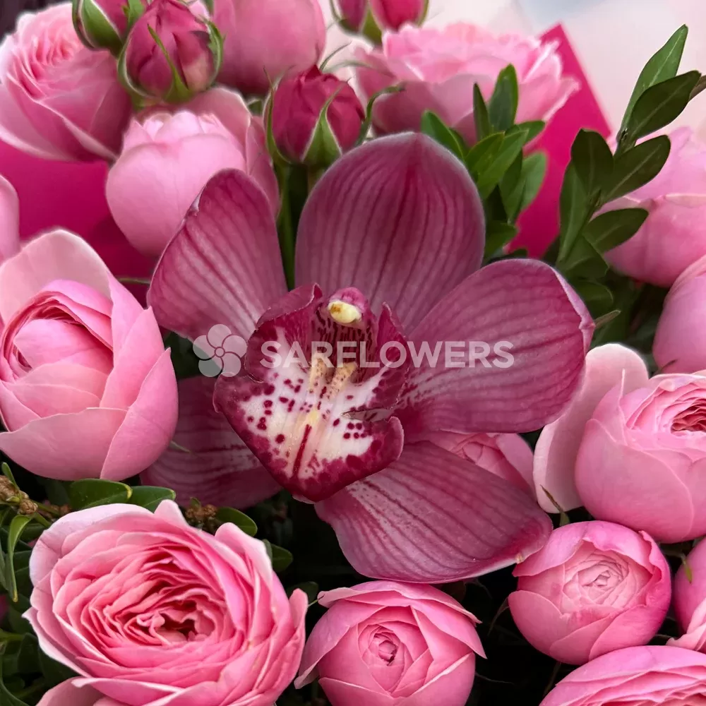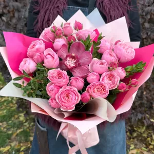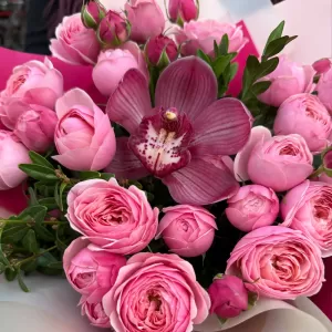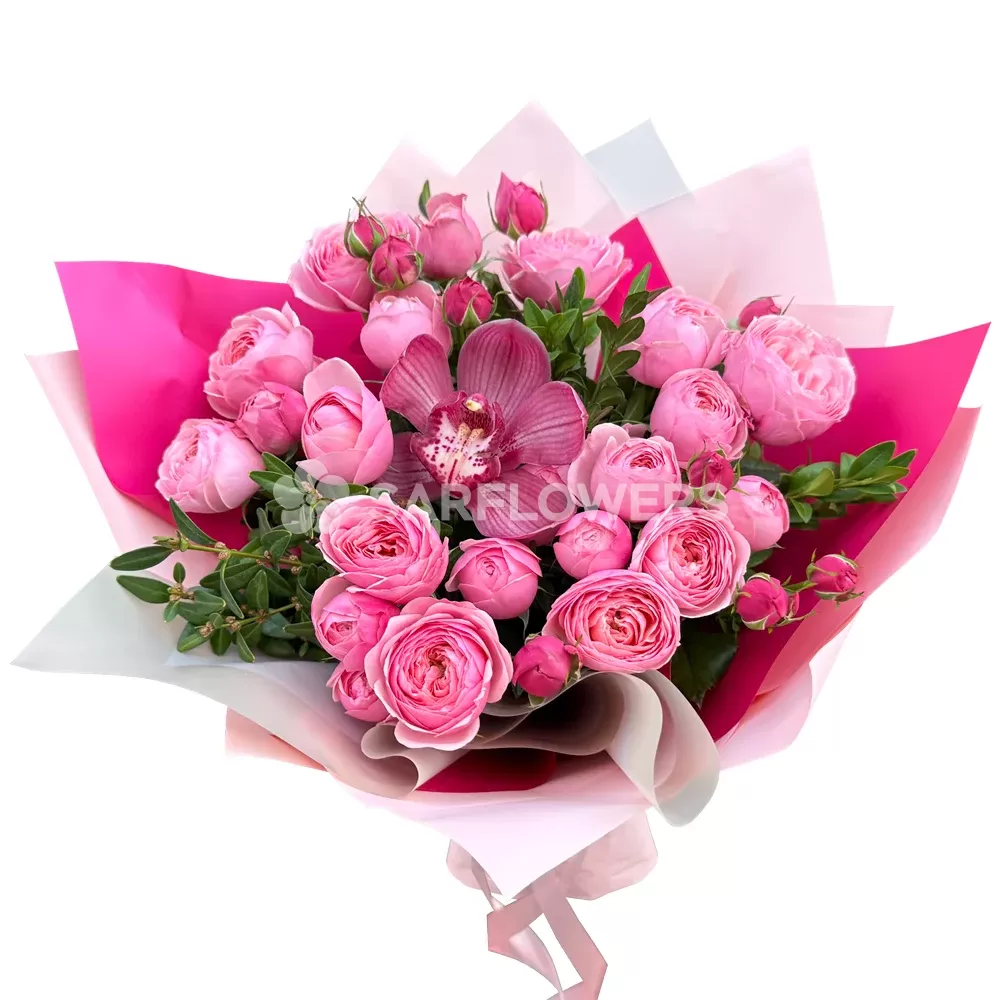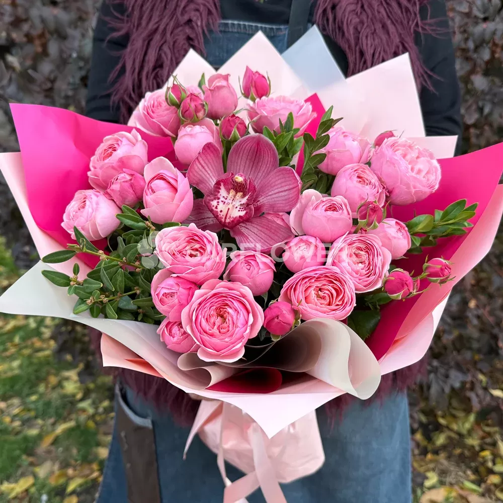 Дуо-букет из пионовидных кустовых роз и орхидеи Цимбидиум.