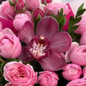 Состав: орхидея Цимбидиум, пионовидная кустовая роза (4), упаковка (матовая), лента, расходный материал.